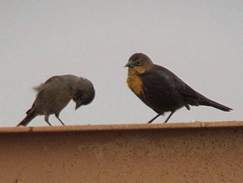 Today I saw a strange behavior; a Brown-headed Cowbird (BHCO) bowing before a Yellow-headed Blackbird (YHBL). Wherever the YHBL was, the nearest BHCOs would assume a crouching position and lower its head (see above photo). Both sexes of BHCO would “bow” near the YHBL. The BHCO would then move toward the YHBL while keeping its head bowed; the YHBL would react by either flying off or pecking at the BHCO’s head. The BHCOs would not fly when pecked at. The three times I saw this behavior it was the YHBL that would fly off and leave.